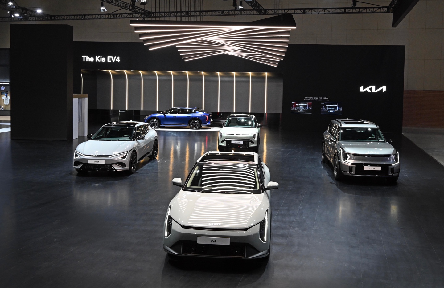 기아는 이번 모빌리티쇼를 통해 EV4와 EV3 GT-Line, EV9 GT 등 전용 전기차 3종도 함께 선보였다. EV4는 533km의 1회 충전 주행거리(산업부 인증 기준)를 제공하며, 기아 EV 라인업 중 가장 높은 에너지 효율인 5.8km/kWh(2WD 기준)를 달성한 준중형 세단이다. 롱레인지와 스탠다드 모델로 운영되며, E-GMP 플랫폼 기반의 고효율 배터리 시스템이 적용됐다. GT-Line은 미래지향적이면서도 다이내믹한 디자인 요소를 강화해 소비자 선택폭을 넓혔다.