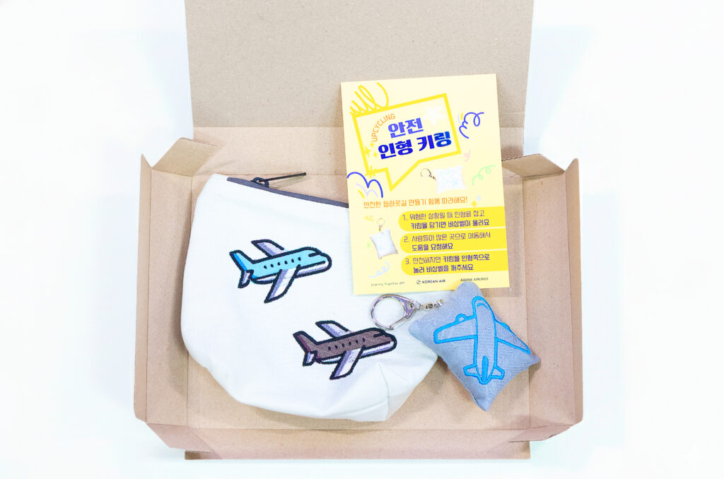같이 기부된 파우치는 테이블보와 양사의 객실승무원 유니폼을 업사이클링한 것으로, 겉면에는 장식용 비행기 패치가 부착돼 시각적 포인트를 더했다. 디자인 요소와 실용성을 동시에 반영한 점이 특징이다.