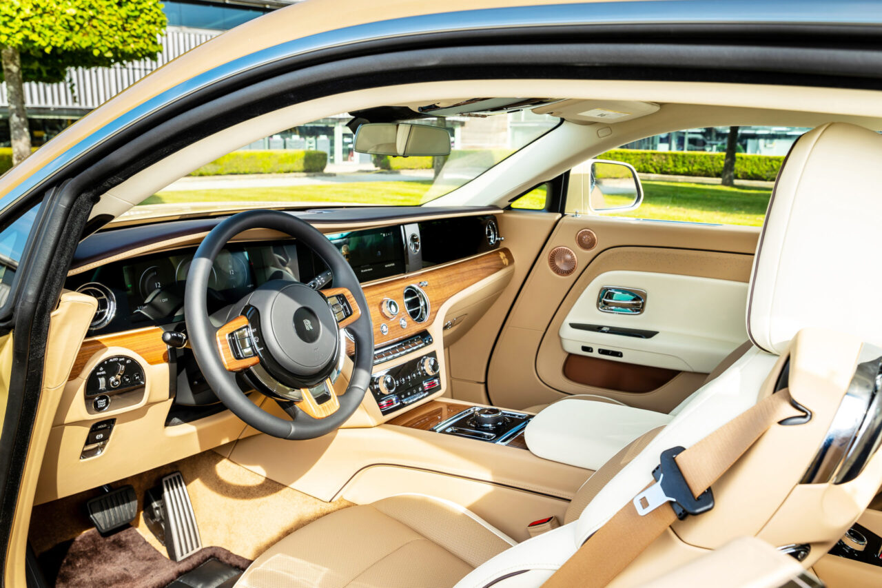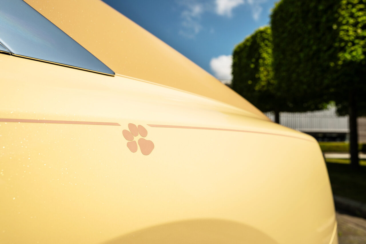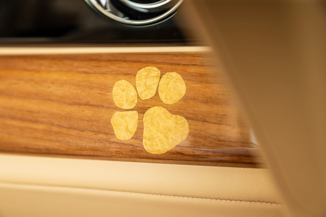 차체는 ‘크리스털 퓨전’ 위에 ‘뷰티풀 베일리’ 컬러를 입혀 따뜻한 베이지빛 톤을 구현했다. 이는 베일리의 귀털 색에서 영감을 받은 색상으로, 상단부는 빛의 각도에 따라 은은하게 변화한다. 어깨선을 따라 이어지는 코치라인에는 베일리의 발자국 모양이 핸드 페인팅으로 정교하게 새겨졌으며, ‘스피릿 오브 엑스터시’ 장식과 같은 로즈 골드 색으로 마감됐다. 후면부 도어실에도 같은 발자국 무늬가 음각 처리되어 차량의 시작부터 끝까지 동일한 테마를 유지한다.