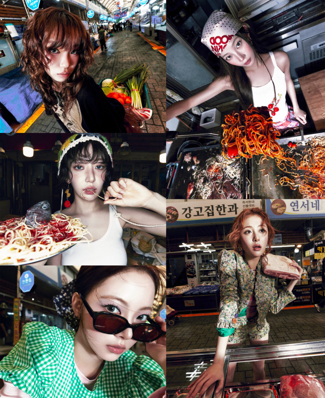 공개된 사진에서 멤버들은 각기 다른 스타일의 의상을 입고 시장 골목을 누볐다. 김채원은 대파가 담긴 쇼핑 카트를 끌며 중심을 잡았고, 사쿠라는 길거리 음식 노점 같은 공간에서 스파게티 면을 들어 올리는 장면을 통해 콘셉트의 묘미를 살렸다. 또한, 토마토 귀걸이와 면처럼 길게 내려오는 뜨개 모자 등 음식 소재를 활용한 아이템들도 시선을 끌었다.