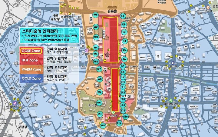 서울청은 인파가 모일 것으로 예상되는 경로를 중심으로 사고 예방을 위한 단계적·체계적 안전관리 대책을 마련 중이다. 행사 구역을 인파 위험도 및 이동 가능 정도를 고려해 4개 구역(코어·핫·웜·콜드)으로 구분했다. 직접 관람이 가능한 구역 외곽에 인파 관리선을 설정하고 지정된 통로 29개소를 통해 관람객이 유입되도록 해 공연장 내 인파 밀집도를 안정적으로 관리하는 ‘스타디움형’ 인파 관리 방식을 적용한다.