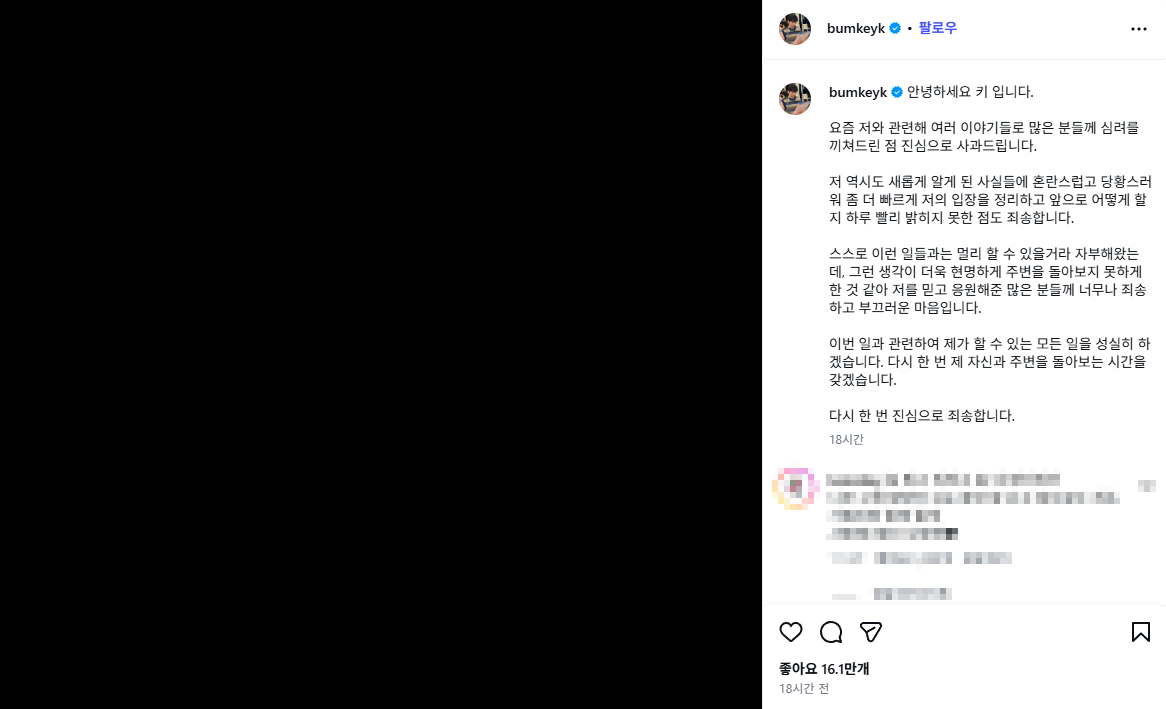 같은 날 키도 자신의 인스타그램을 통해 사과의 뜻을 전했다. 키는 “최근 저를 둘러싼 여러 이야기로 많은 분께 심려를 끼쳐드려 진심으로 사과드린다”며 “새롭게 알게 된 사실에 당황했고, 빠르게 입장을 정리하지 못한 점 또한 죄송하다”고 전했다. 이어 “그동안 이런 일들과는 거리가 있을 것이라 생각해왔지만, 오히려 그 자만이 주변을 세심하게 살피지 못하게 한 것 같다”며 “믿고 응원해주신 모든 분께 죄송하고 부끄러운 마음”이라고 덧붙였다.