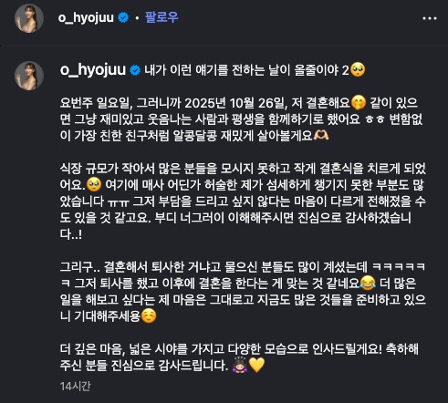 오효주는 지난 20일 자신의 SNS를 통해 “이번 주 일요일, 2025년 10월 26일에 결혼한다”고 밝히며 “내가 이런 얘기를 직접 전하게 될 줄 몰랐다”고 소감을 전했다. 이어 “식장 규모가 작아 많은 분들을 초대하지 못했다. 부족한 점이 있더라도 너그러이 이해해 주시길 바란다”고 덧붙였다.