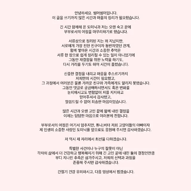 썸머썸머는 지난 31일 자신의 유튜브 채널 커뮤니티에 올린 입장문을 통해 “긴 시간 함께해온 도미닉과 저는 오랜 숙고 끝에 부부로서의 여정을 마무리하기로 했다”고 밝혔다. 갑작스러운 한마디가 아니라 오랜 고민 끝에 꺼낸 고백이라는 점을 분명히 하며, 두 사람이 이미 서로의 관계를 깊이 돌아본 뒤 결정을 내렸음을 전했다.