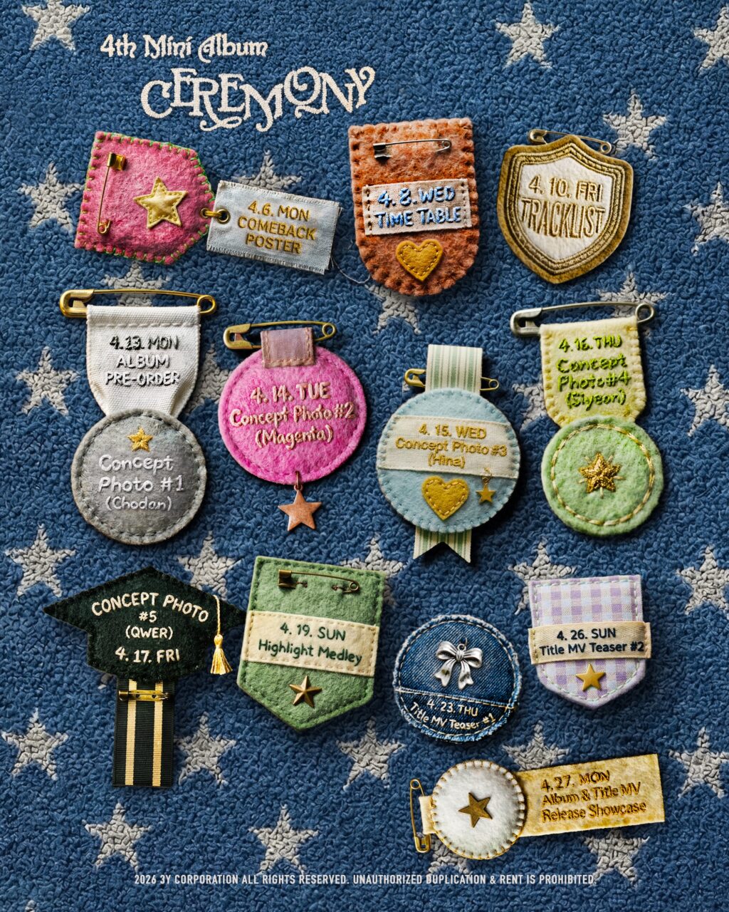 지난 8일 공식 사회관계망서비스(SNS)에 올라온 타임테이블에는 새 앨범 콘셉트를 짐작할 수 있는 티징 콘텐츠 공개 순서가 담겼다. 각양각색의 패치를 배경으로 구성한 이미지에는 일정표와 함께 앨범 분위기를 암시하는 요소를 배치했다.