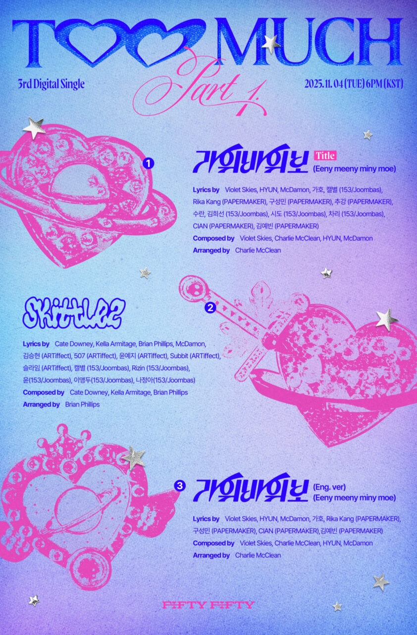 프티피프티는 16일 공식 SNS를 통해 다음 달 4일 발매 예정인 디지털 싱글 ‘투 머치 파트 원’의 트랙리스트를 게재했다.