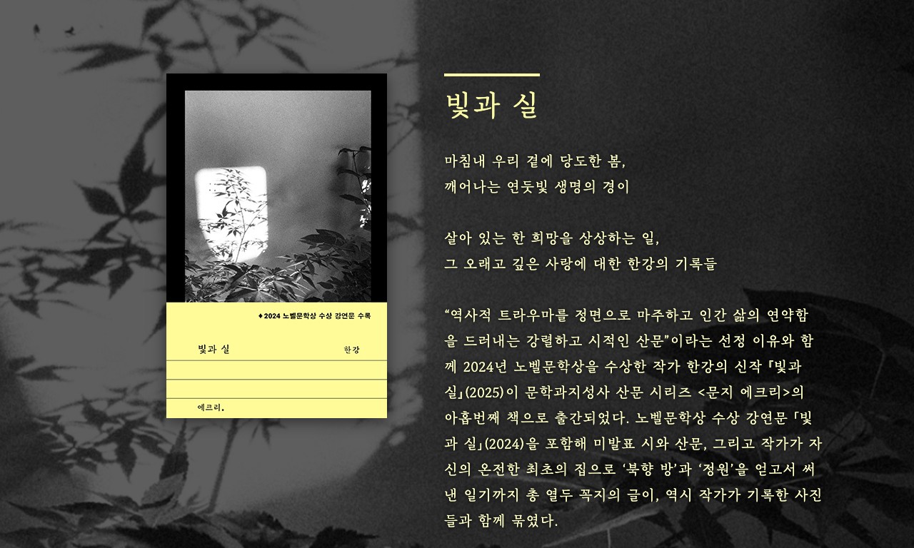 ‘빛과 실’은 문학과지성사의 산문 시리즈 ‘문지 에크리’의 아홉 번째 작품으로, 수상 이후 처음 세상에 나온 한강의 글이라는 점에서 많은 독자의 이목을 집중시켰다.