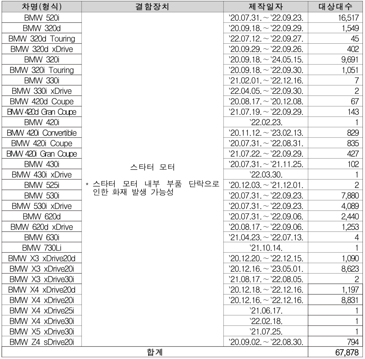 비엠더블유코리아는 32개 차종 1건이 해당된다. 32개 차종 6만 7,878대는 스타터 모터 내부 부품 단락으로 화재가 발생할 가능성이 있어 3월 4일부터 시정조치에 들어간다.