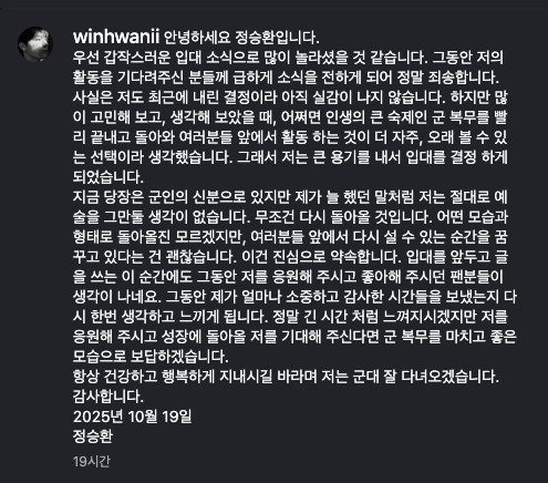 우선 갑작스러운 입대 소식으로 많이 놀라셨을 것 같습니다. 그동안 저의 활동을 기다려주신 분들께 급하게 소식을 전하게 되어 정말 죄송합니다.